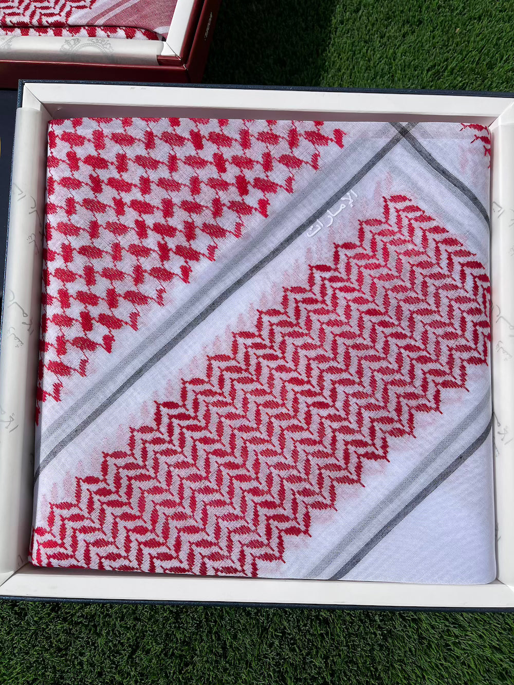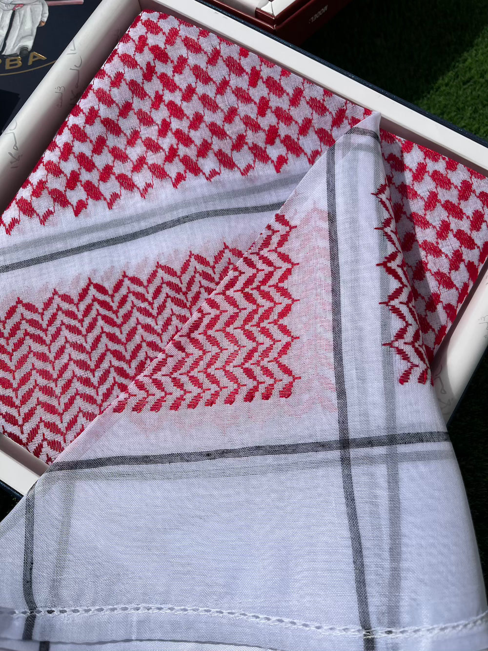 The Fujairah Edition stands out with a distinct grey-line detail woven into the classic red and white pattern — a refined touch that sets it apart from standard designs. Crafted in a stiff weave, this shemagh offers strong structure and presence, holding its shape effortlessly throughout the day.