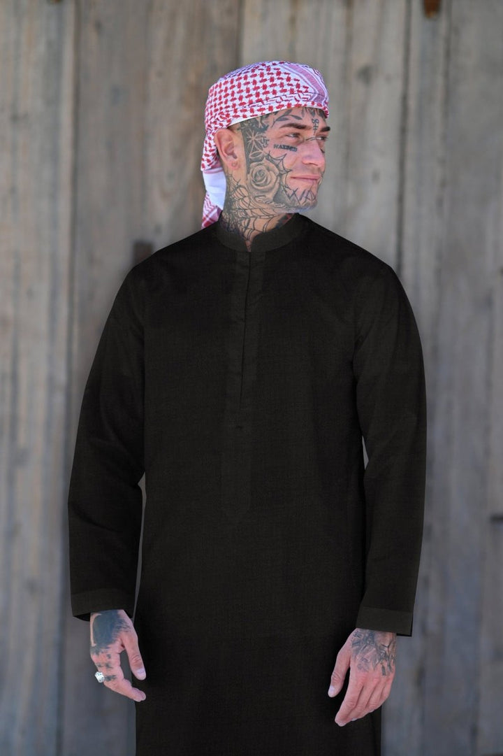 Step into refined luxury with our Men's Black Cashmere Wool Bahraini Thobe from mylittlejubba.com. This sophisticated thobe, known as a kandora, jubba, thawb, or dishdasha, is crafted from premium cashmere wool, offering exceptional warmth, comfort, and durability. The deep black color adds a touch of modern elegance, making it ideal for Jummah, Eid, weddings, and formal occasions. Reflecting the rich cultural heritage of Bahraini fashion, this thobe combines traditional craftsmanship with contemporary style, creating a timeless piece for the discerning Muslim man. Elevate your wardrobe with our Black Cashmere Wool Bahraini Thobe and make a distinguished statement.