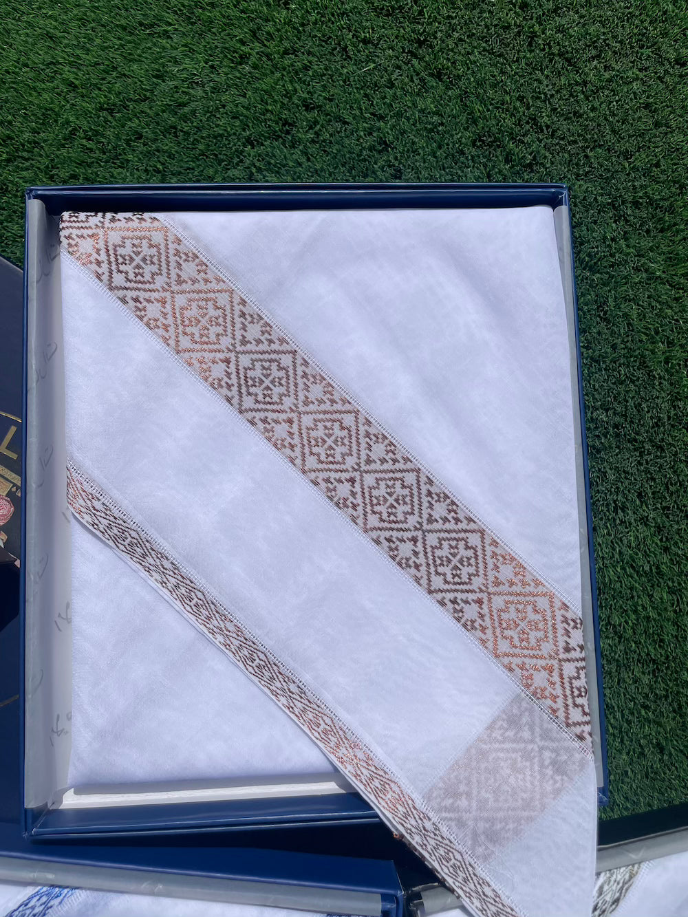 Warm, earthy, and radiant — the Bronze Metallic Keffiyeh delivers refined edge to traditional wear. Woven from soft yet structured cotton, it maintains its shape when styled as a ghutra and looks regal under an Igal.