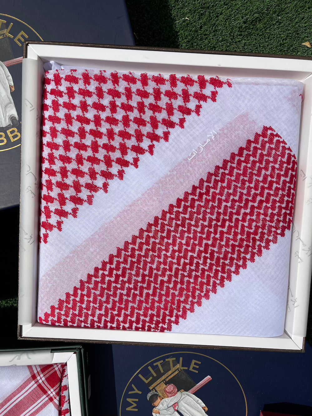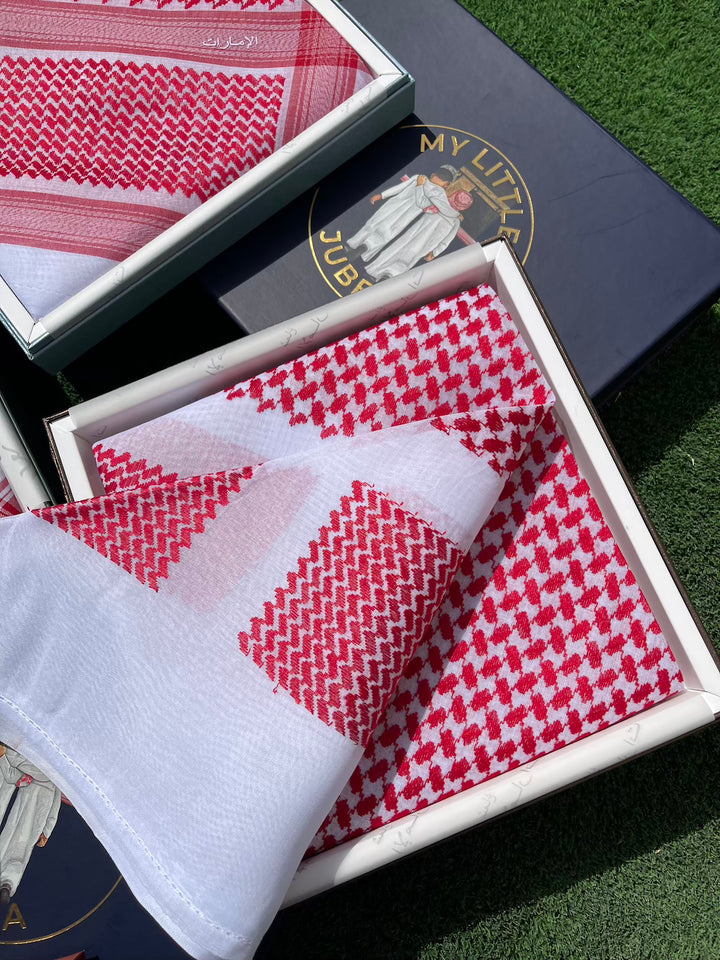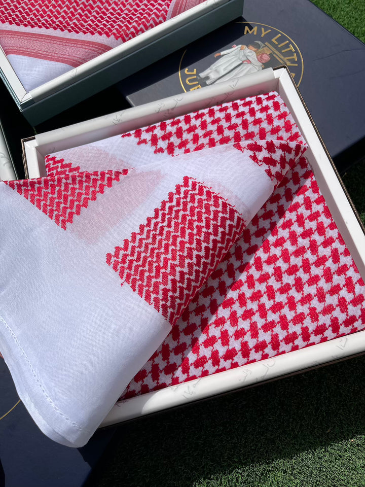 The Jeddah Keffiyeh blends coastal elegance with timeless tradition. Woven in a premium stiff weave, this red and white scarf delivers structure, presence, and distinction — whether styled with an igal, worn loose around the shoulders, or paired with a modern jacket.