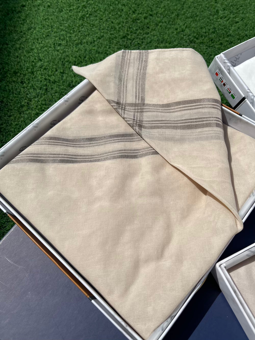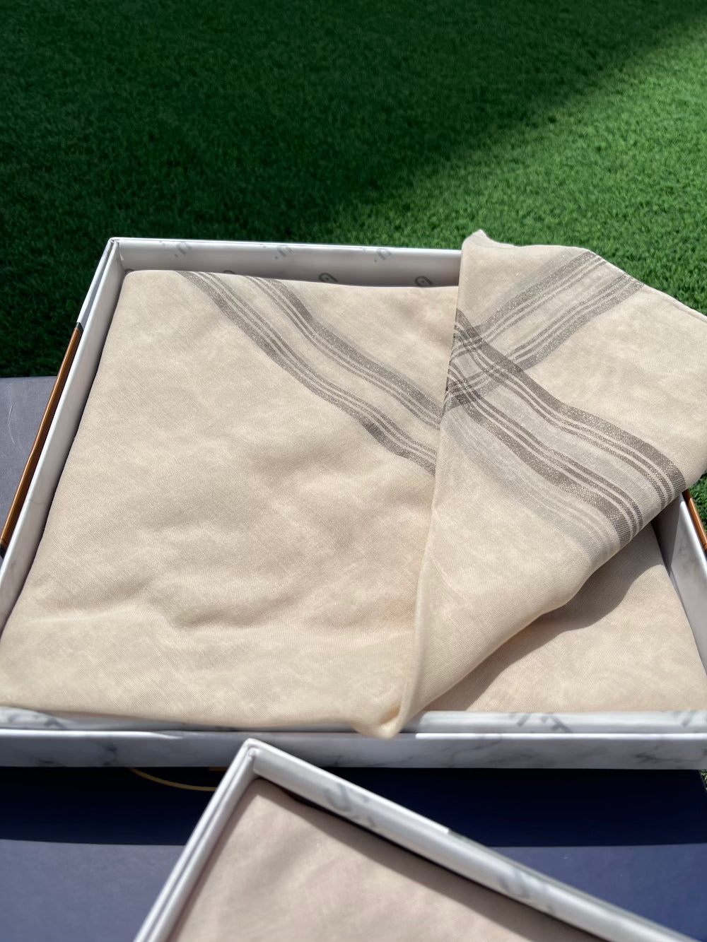 Woven from 100% breathable cotton, it offers a smooth finish — not too stiff, not too soft — making it perfect for styling as a headscarf or shoulder drape. Finished with clean edges and no tassels for a minimal, tailored look.