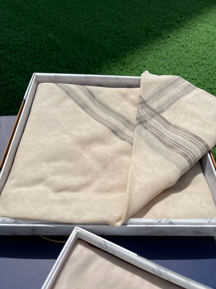 The warm latte keffiyeh draws from nature’s most grounded palette — a muted beige infused with soft brown undertones, evoking desert sands at dusk. Framed with a fine silver metallic border, it adds quiet sophistication to a fabric steeped in tradition.