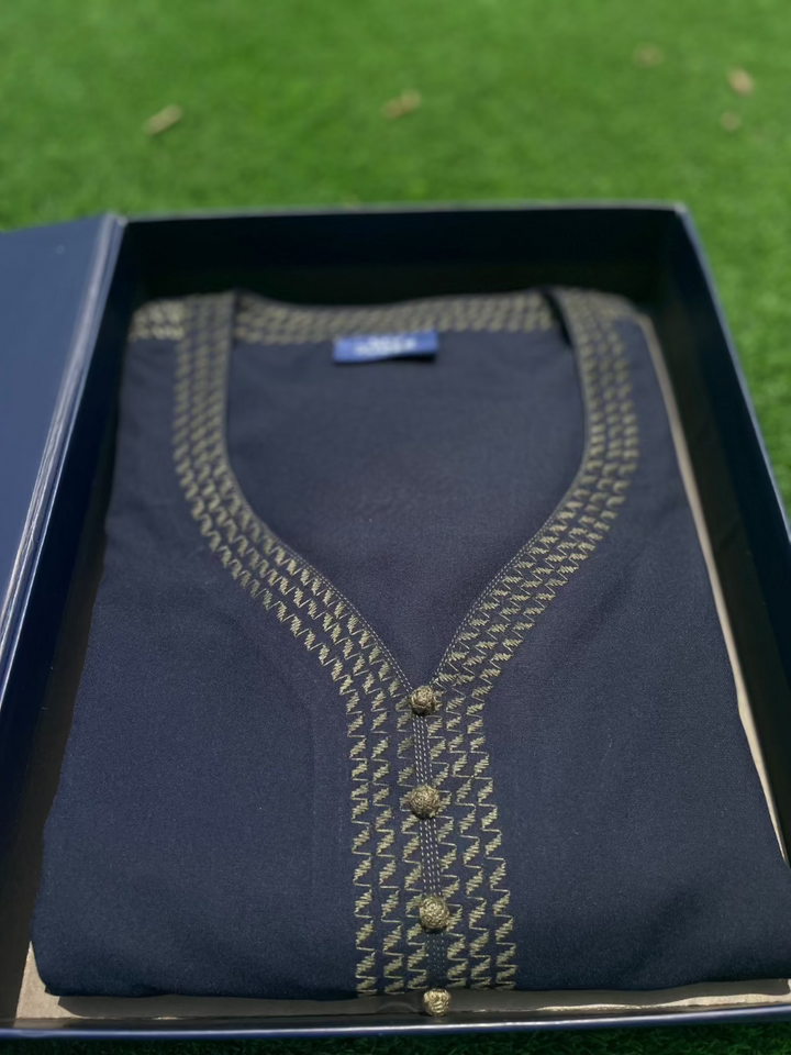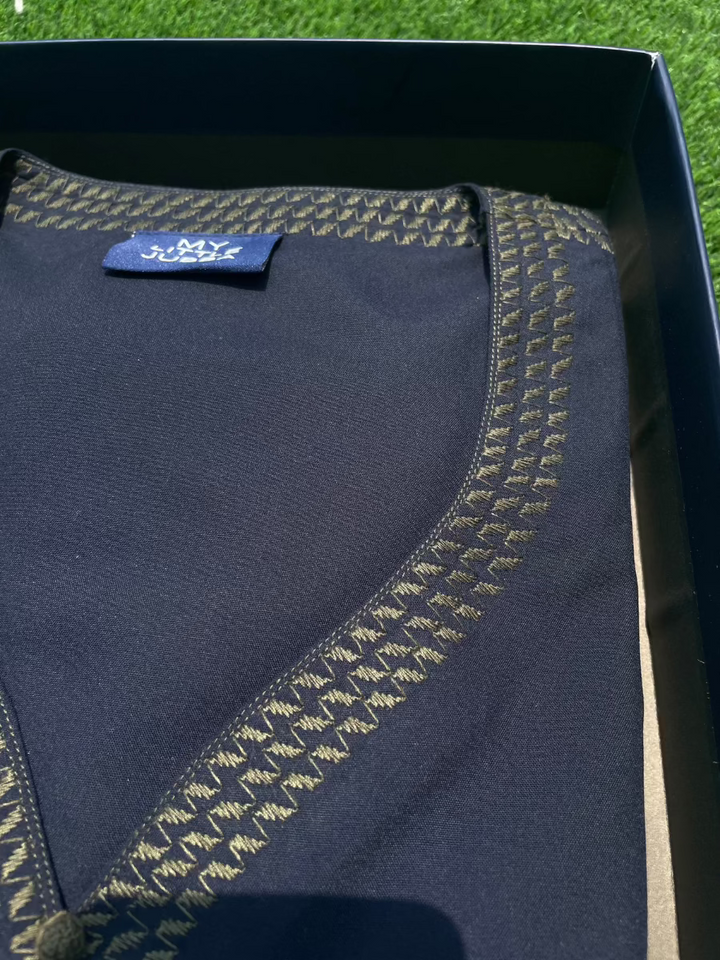 Mens Navy with Olive Embroidery Maghribi 3/4 Sleeve Thobe