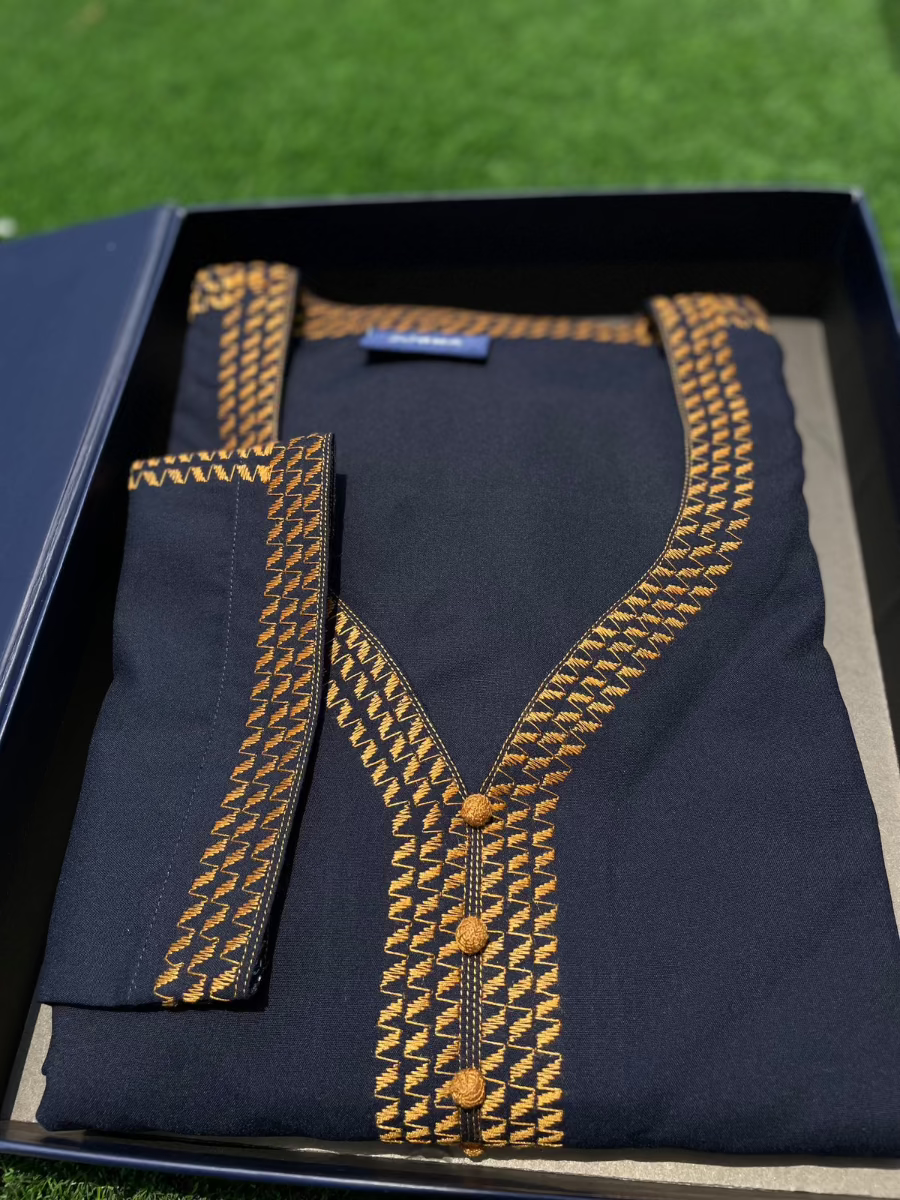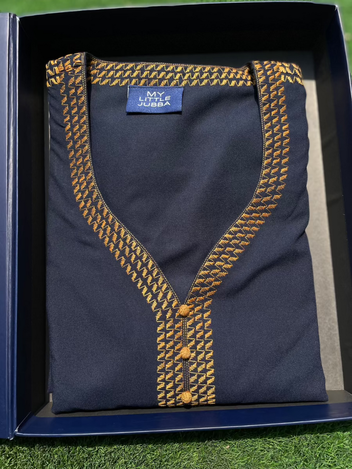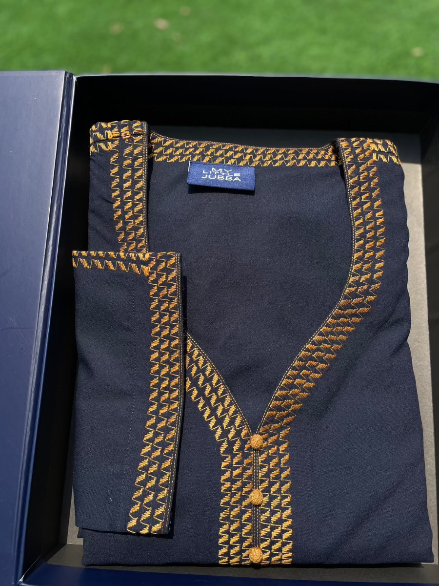 Mens Navy with Orange Embroidery Maghribi 3/4 Sleeve Thobe